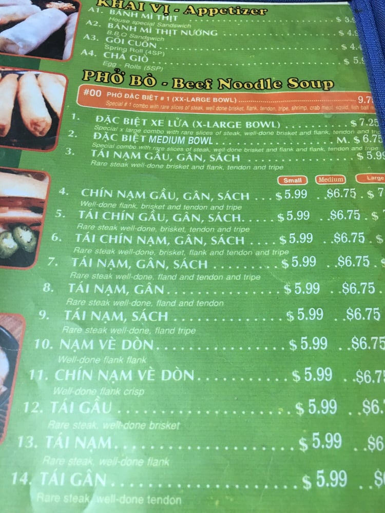 Medium bowl. Special combo with rare slices of steak, well done brisket and flank, tendon and tripe.
